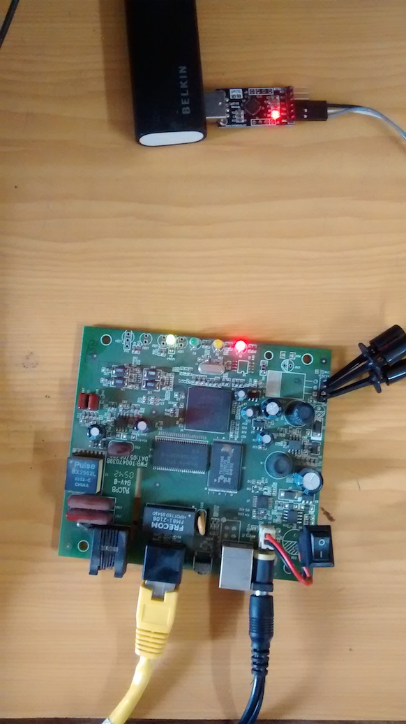 So it became perfectly clear that the device is either severely bricked or simply dead. As I didn't want to just trash the device, I opened the device and was happy to see that there was an easily accessible serial port. Connected my serial adapter using the wire tester hooks and I was looking at the serial output in no time. The pins are GND-TX-RX-VCC from the bottom.